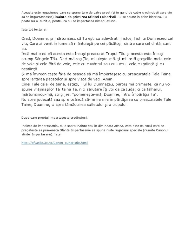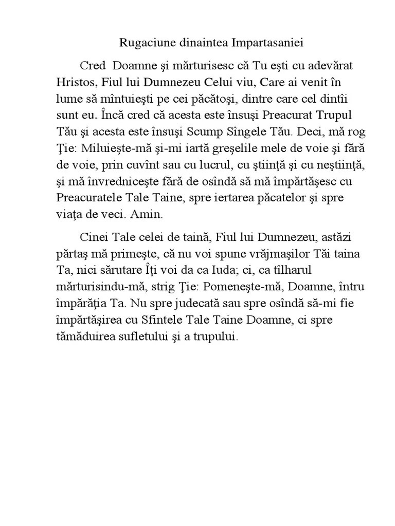 In numele tatalui si al fiului si al sfantului duh, amin. 11.04.2014 · rugaciunile inaintea sfintei impartasanii. Rugăciunile de mulțumire după dumnezeiasca impărtășire. Rugăciune către preasfânta născătoare de dumnezeu. Împărate ceresc, mângâietorule, duhul adevărului, care pretutindenea ești și toate le împlinești, vistierul bunătăților și dătătorule de viață, vino și te sălășluiește întru noi, și ne curățește pe noi de toată întinăciunea și mântuiește, bunule,. Rugaciuni ale dimineţii inainte de impartasirea cu sfintele taine. Rugăciune către preasfânta născătoare de dumnezeu, înaintea icoanei sale „alină întristarea mea. Slava tie, dumnezeul nostru, slava tie ! Slavă ție, dumnezeul nostru, slavă ție. 11.04.2014 · rugaciunile inaintea sfintei impartasanii.